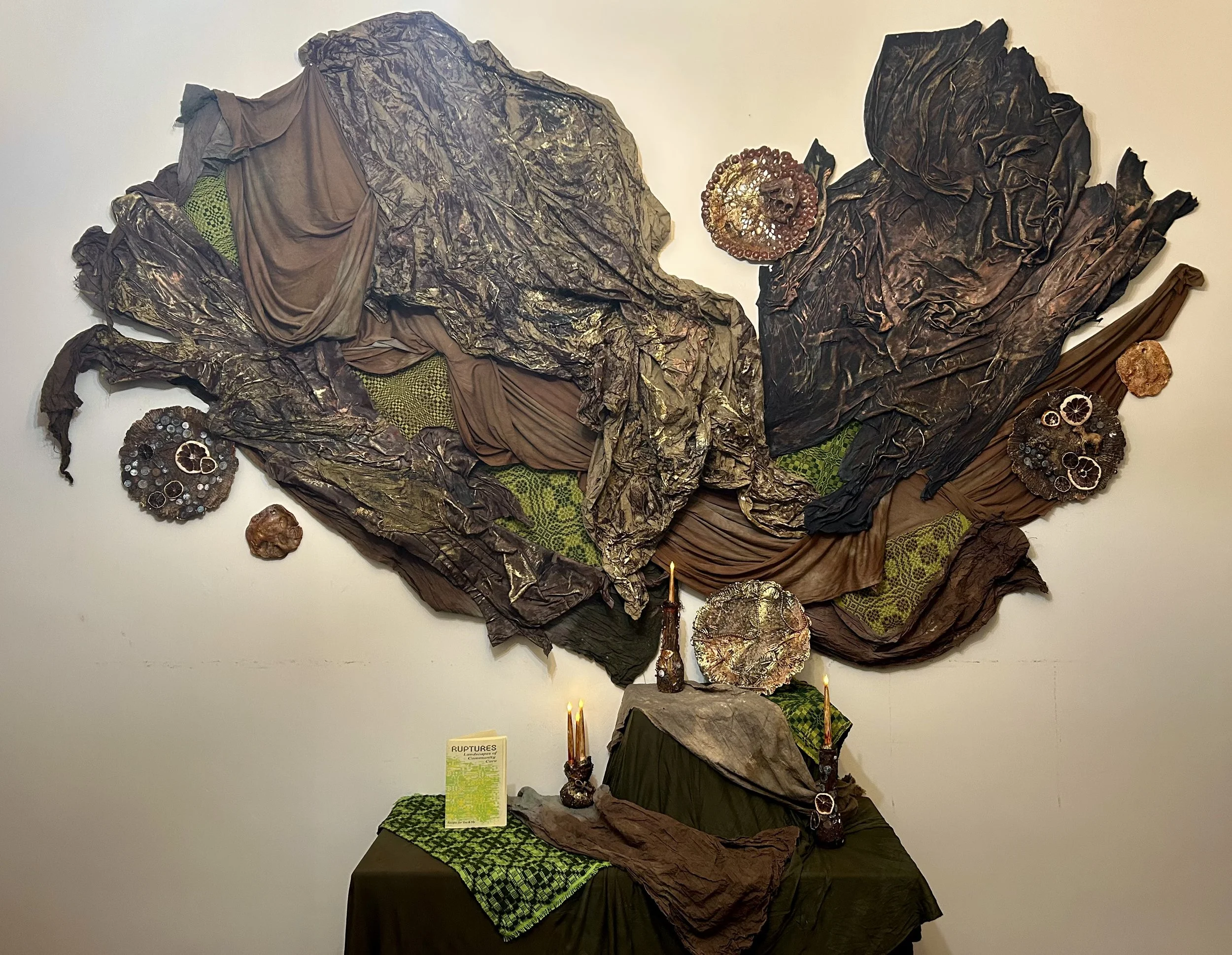 Ruptures: Landscapes of Community Care is a publication and a site specific sculptural installation inspired by queer world building and collective action. Installed in the kitchen of Dyke+ Art Haus in Philadelphia, the work pulls recipes of comfort sourced from our queer community alongside moments of revolution and altered motifs of domesticity. Embracing the tension between organic textures and intricate gridded weavings, the work questions what can grow when systems break and rupture. Acknowledging the legacy of LGBTQ+ interdependence and the life affirming sacred space of sharing a meal, the installation is accompanied by dishes made by artists KT Abadir-Mullally and Natalie Manes.